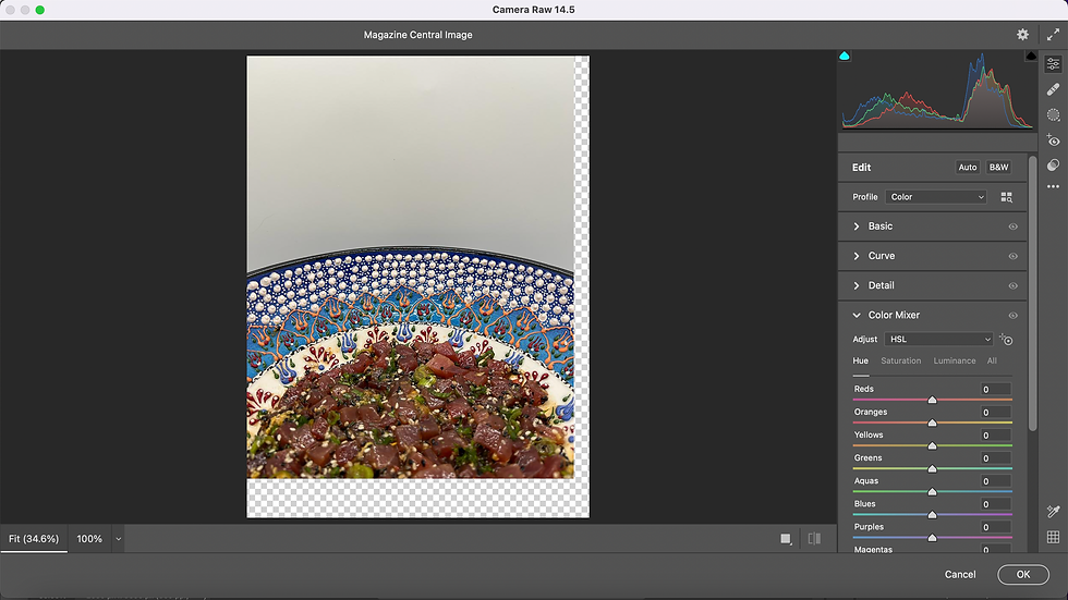 Photographed during the second part of my final photoshoot, the photo to the left was my the image I chose for my cover. I was 100 percent sure that I wanted to edit this image on Photoshoot since I thought it was dark and unappealing, but while doing so, I noticed something else—the bowl took up a vast majority of the page! Therefore, if I created my cover with this unedited image, I most likely wouldn't have been able to fit the proper magazine elements without covering most of the dish. In other words, it was crucial that I edited this photo. The process of how I did so is illustrated below!